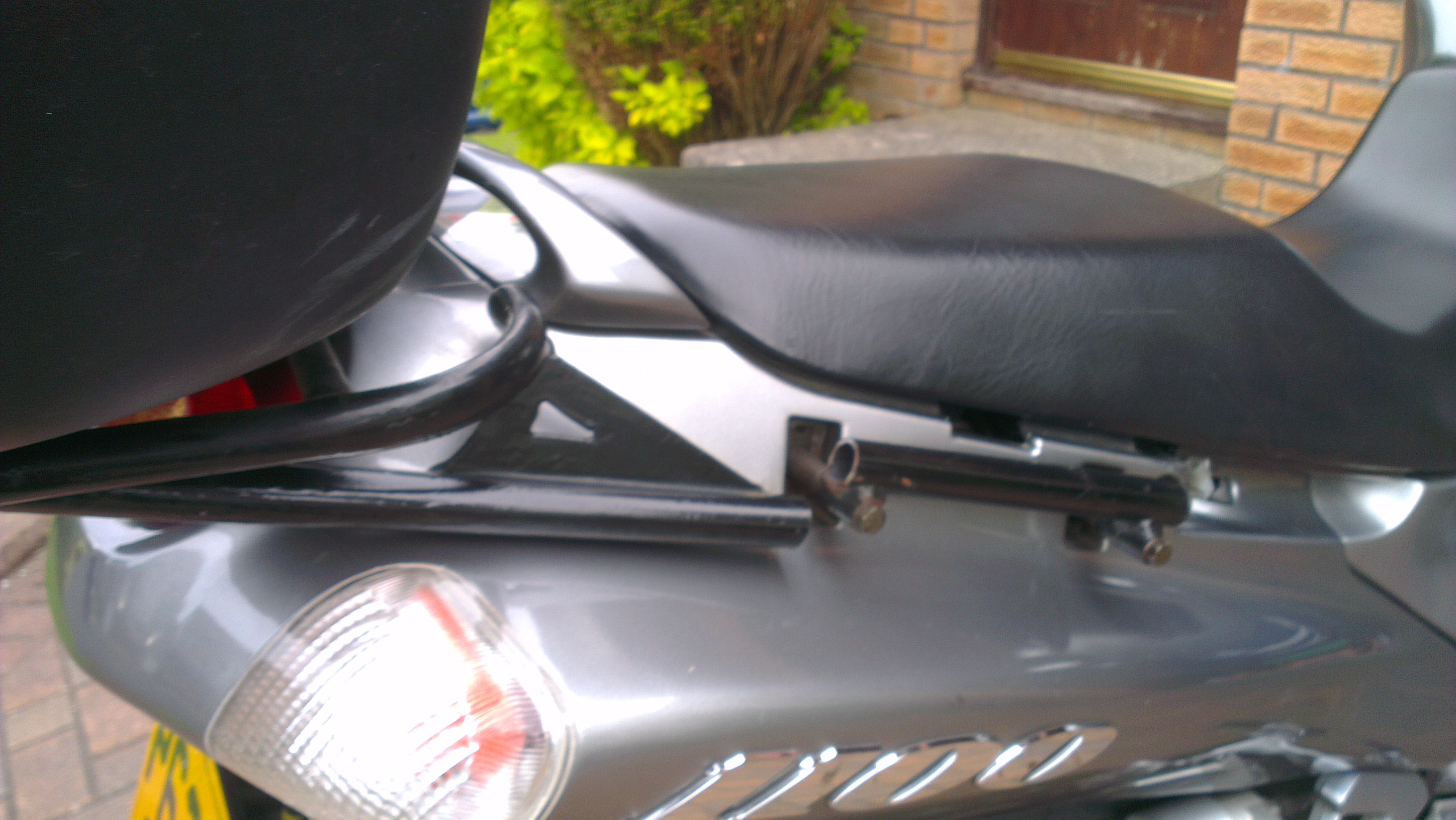 Wednesday evening I rode the bike home only to find when I went to get my bag out of the top box that the rack holding it had broken. In fact I was bloody lucky – the other side of the rack had almost gone too – that would have meant the top box coming off, bouncing down the road and maybe causing an accident – REALLY not good!