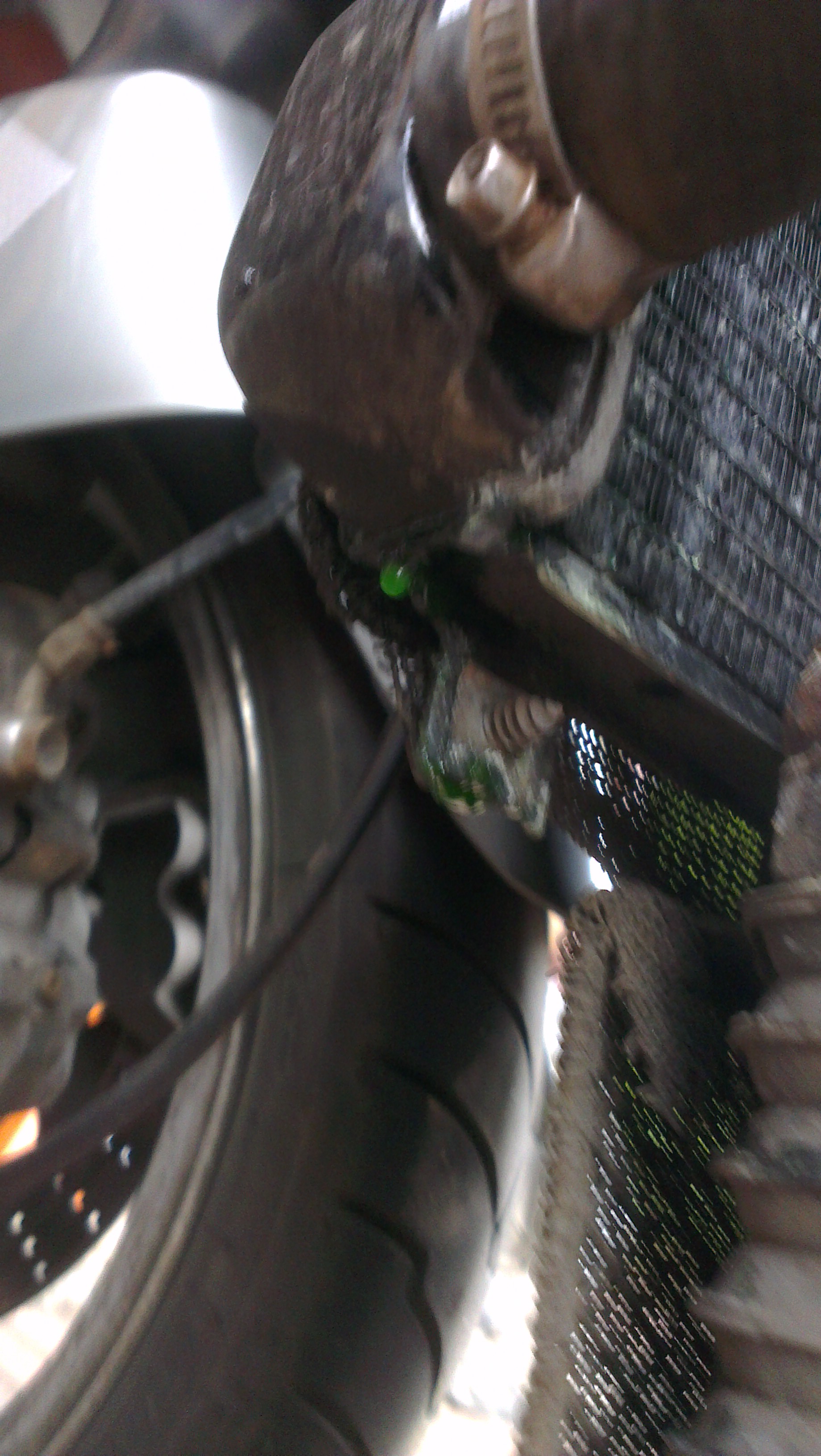 Rolling the bike out of the garage I noticed a suspicious puddle on the floor under the bike. Coolant. Feck.