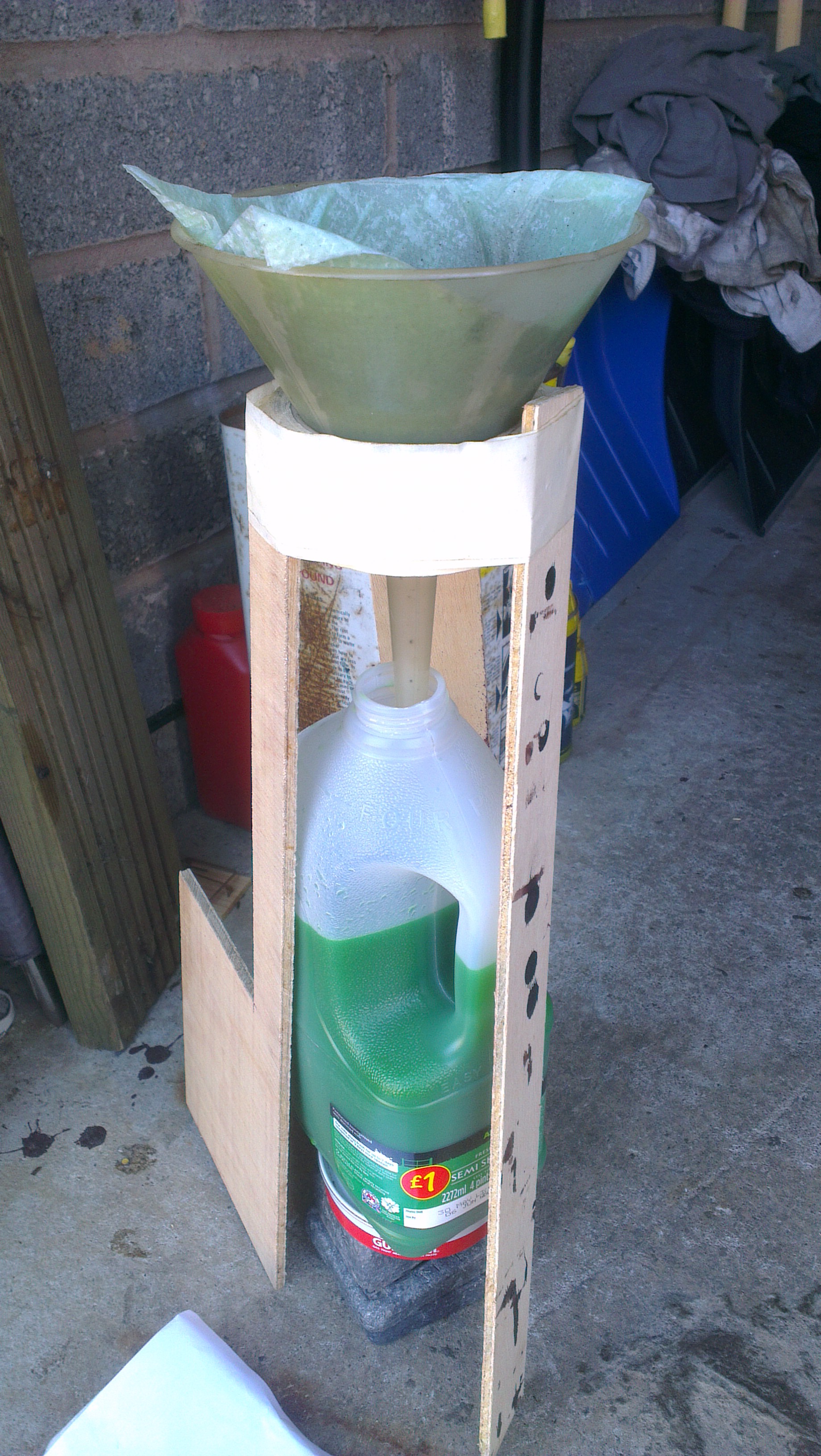 I leave you with my heath robinson coolant filtration system, involving masking tape, some ply wood, a funnel, some kitchen roll and an empty milk carton! Hi tech…