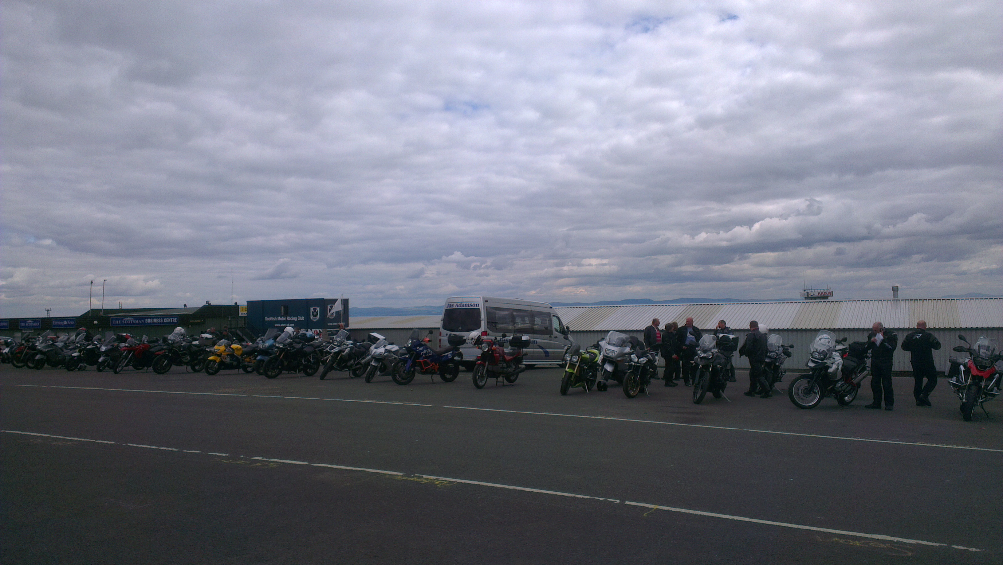 After the briefing we rode our bikes down to the pit lane and the garages there, and removed all luggage etc. Since we were the IAM, and riding in structured groups, with instructors at all times, some of the normal track rules were relaxed – for example, road riding gear, goretex kit etc, was fine, as was having video cameras mounted on bikes and helmets – a practice I understand is often discouraged or even forbidden on track days. However, as the chief marshal had pointed out, he would be EXTREMELY disappointed to have to speak to anyone in our group after the briefing – clearly best behaviour was expected.