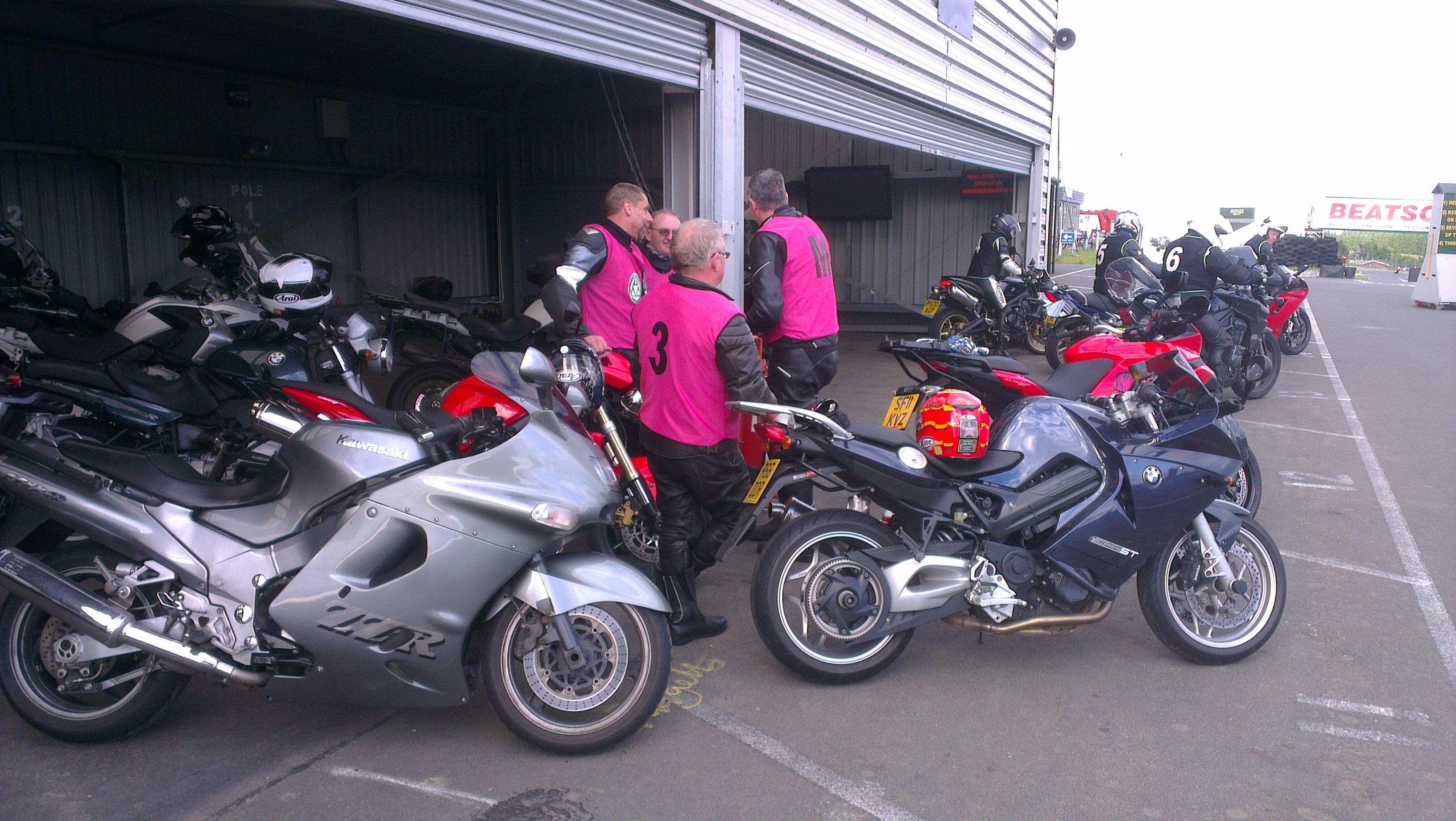 I begged off work early, fuelled the bike and got to the circuit around 3:30. There were already 20 or so bikes there, and there were plenty more still to come. After saying hello to a few familiar faces it was time to get my driving licence checked over, and hand in the signed forms that declare you are well aware you may be about to die horribly, and absolve everyone but yourself of any blame. And then the true horror – my group was down to be wearing orange bibs, but they didn’t have any, so we got PINK ones instead – VERY pink bibs!! Oh, the shame!