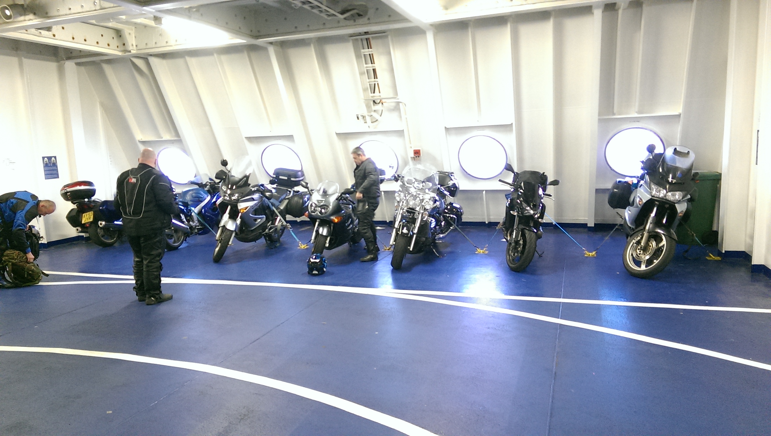 Ferry’s – P&O apparently take the best care of bikes – you’ll be directed to a point so that the bike’s saddle is between two tie-down points, then there will be ratchet straps available that you are expect to fit – put the bike on it’s side stand, not centre stand, and engage 1st gear, hook the strap in place with the pad on the seat and the ratchet on the stand side of the bike, pull the strapping through the ratchet to take up the easy slack, then use the ratchet to tighten it up – just tight – not so tight you leave a furrow in the seat!