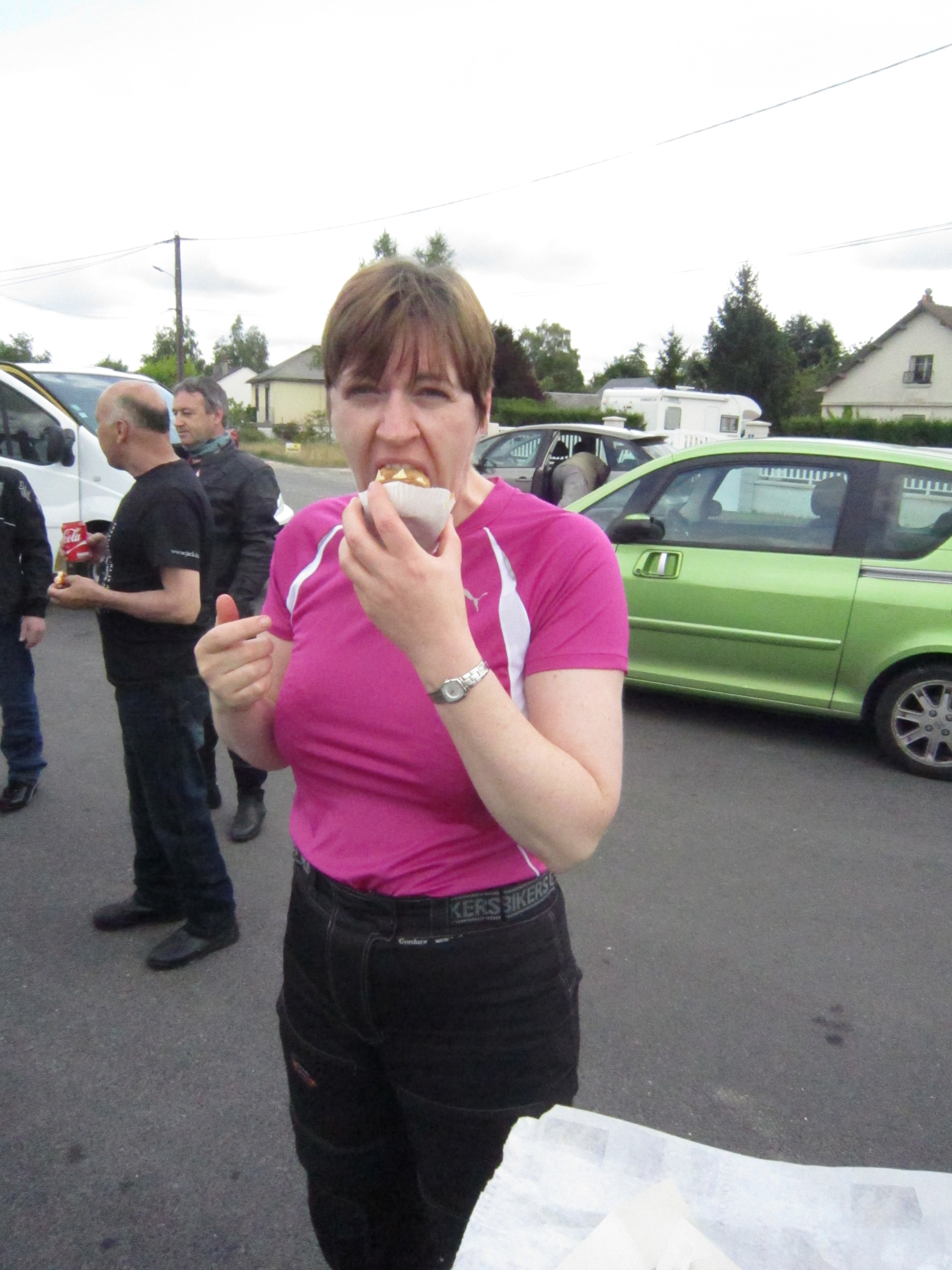 On the route from Le Mans to our main Destination, Riders Rest, we had arranged to meet another member at her pal’s café. That was all very well, but firstly somehow wires had got crossed so this person had thought we’d be there the previous day. Er, no, that was never the plan… But her pal had arranged to lay on a big spread for us, so not wanting to let her down, off we went, even though the person we were going there to meet up with now couldn’t make it along.